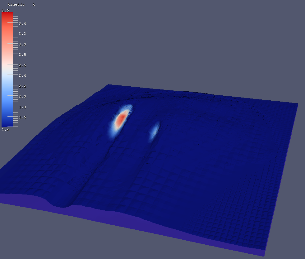 Below the results of velocity-X and kinetic-k as they have been presented in an iso-surface near the hub height of the wind turbine rotors, inside the atmosperic boundary layer.